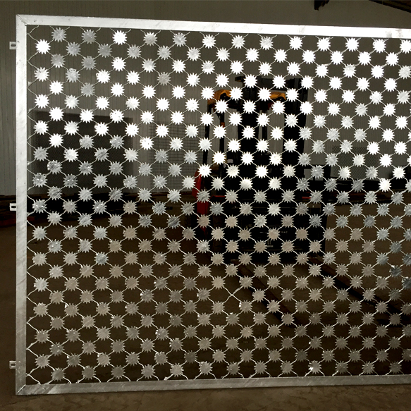 1、 梅花刺片護欄網 又名太陽花刺片隔離網,為單層梅花刺片網,直徑不小于75cm,刺片厚1.5mm,采用Q 235低碳鋼板沖壓成型。 2、網片為菱形網孔,網格尺寸∶120mm*110mm(…