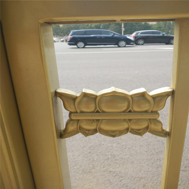 黃金護欄當中不可少的為蓮花件,無論是什么樣的黃金護欄蓮花件基本上是必不可少的,只要有蓮花件的存在,人們會普遍想到黃建護欄,蓮花件的材質分為沖壓件和鑄鐵件。對比之下沖壓件除了價格便宜,別的都沒有鑄鐵件好。蓮花鑄鐵件外形圓滑、飽滿。在護欄上面上特別有立體感。黃金護欄中最上面或是最下面也有添加祥云的,其材質同蓮花件一樣,分為沖壓和鑄鐵的。