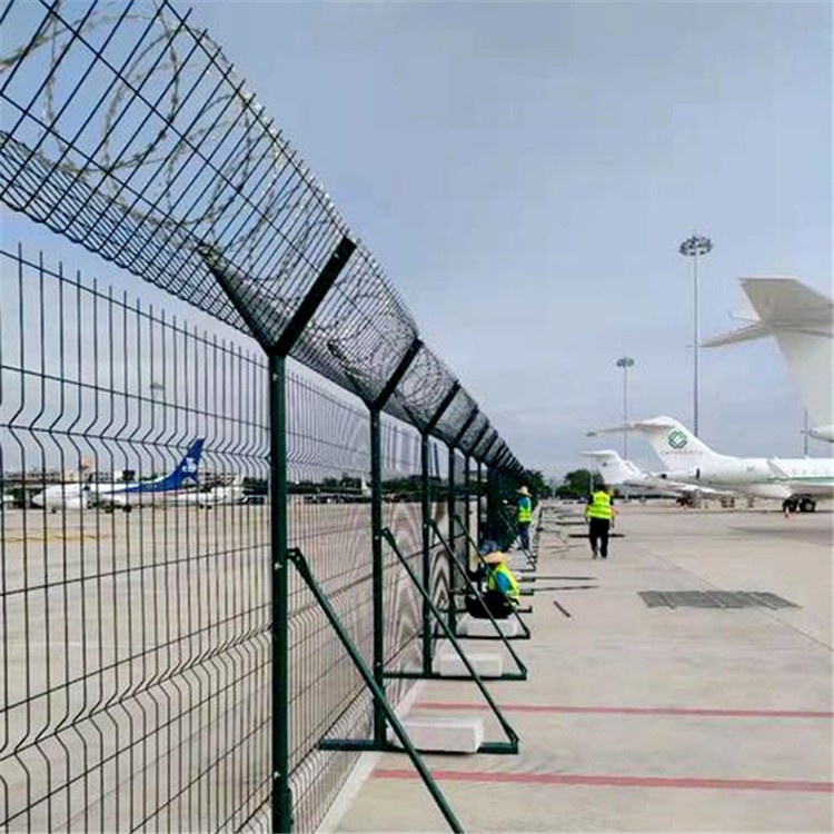 如果在飛機場圍界防護網頂部加裝刀片刺絲、刀片刺網后又很好的增強了安全防護性能。采用電鍍、熱鍍、噴塑、浸塑等防腐形式,具有很好的抗老化、抗曬、耐腐蝕等特點。其產品造型美觀、花色多樣,既起到圍欄作用,又起到美化作用。由于具有安全性高、防攀爬能力好,網片連接方式采用特制SBS緊扣件,有效防止人為的破壞性拆卸,橫向四道折彎加強筋,使網面強度顯著增加。