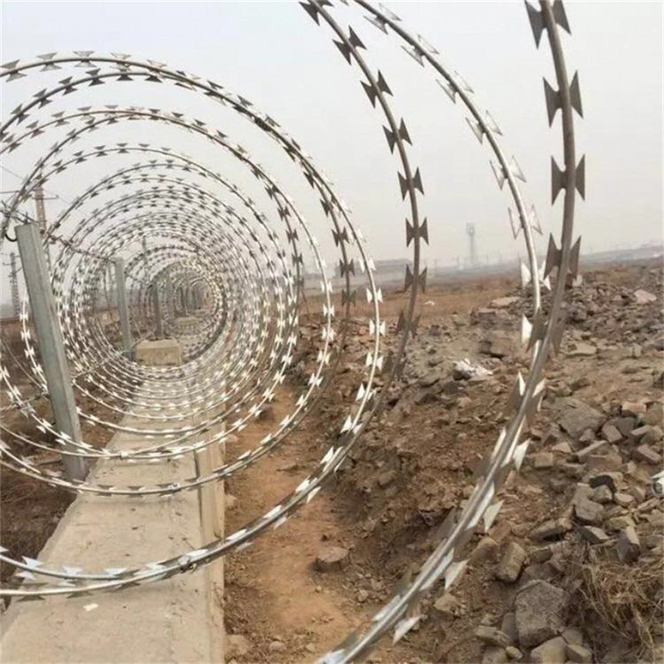 監獄護欄的刀片刺繩是一種熱鍍鋅鋼板或不銹鋼薄板沖壓出尖銳的刀片,高張力鍍鋅鋼絲或者不銹鋼絲做芯線組合而成的阻絕器材。由于刺網造形獨特不易觸摸,因而能達到極好的防護隔離效果。