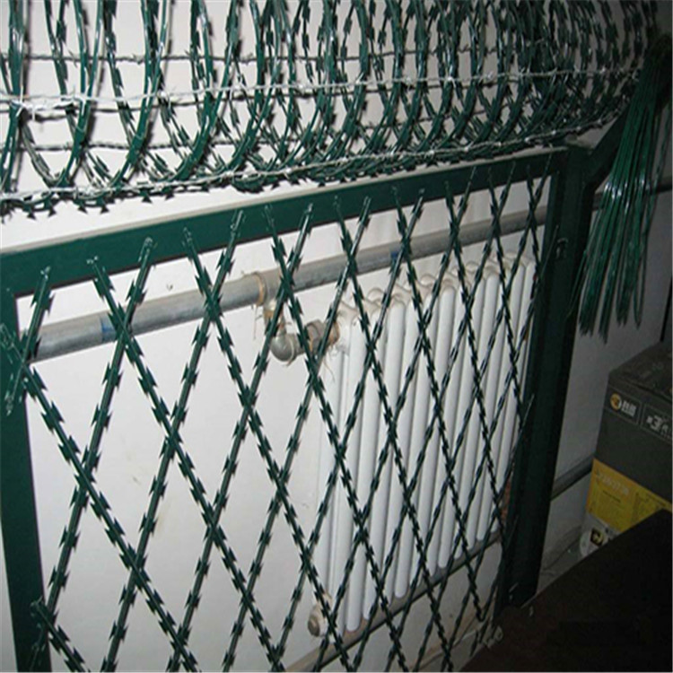 刺繩護(hù)欄網(wǎng)是在兩條刀片刺網(wǎng)之間以不銹鋼片和鍍鋅鋼片強(qiáng)力夾扣,展開后即呈交叉狀,本產(chǎn)品具有防腐、防老化、抗曬、耐候等特點。使用在監(jiān)獄防護(hù)上更起到防攀爬的作用。