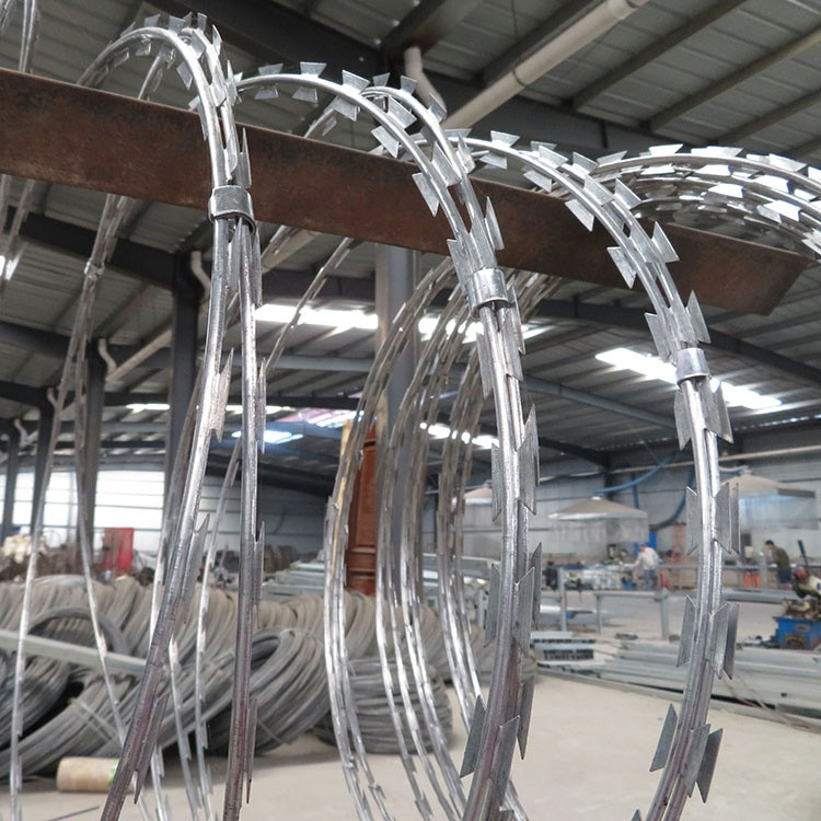 監獄刀片刺繩是用在監獄護欄網頂端的刀片刺繩,是一種新型防護網,由銳利尖角刀片和芯線組成,刀刺、刀型整齊、刀片銳利、排列均勻致密、連接牢固。強度和安全防御性級別很高