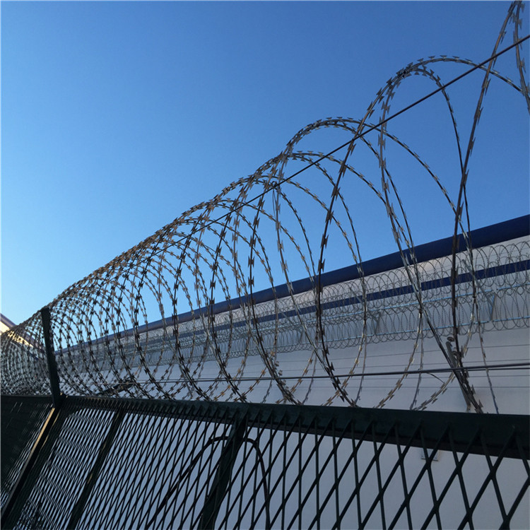 螺旋型刀片刺絲, 螺旋單一型刀片刺網(wǎng)是由一根蛇腹型刀片刺繩環(huán)繞而成,不需要使用卡子來(lái)固定,按照其展開(kāi)的自然形式進(jìn)行安裝。是刀片刺繩布置的一種,它沿墻壁或柵欄自然環(huán)繞來(lái)達(dá)到防護(hù)目的。單螺旋刀片刺繩一般使用的刀型是CBT-60和CBT65。材質(zhì):優(yōu)質(zhì)低碳鋼絲, 鍍鋅、涂塑、噴塑 。特點(diǎn):網(wǎng)身剛硬,可以安裝傳感裝置等、不必用張力絲、不需要高技術(shù)工人維護(hù)、易安裝、維護(hù)成本低。