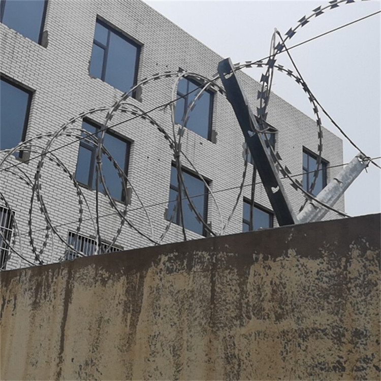 是一種近年發(fā)展起來的防護(hù)、隔離能力較強的新型防護(hù)網(wǎng)產(chǎn)品。它采用鋼板沖壓成型包附于鋼絲(筋絲)之上,由銳利尖角鍍鋅鋼板或不銹鋼薄板做刀片,高張力鋼絲做芯線組合而成的。鋒利的刀型刺由雙線扣裝后成蛇腹?fàn)睿让烙^又讓人不寒而粟。起到了很好的阻嚇作用。該產(chǎn)品具有美觀、防阻效果好、施工便利等優(yōu)點。