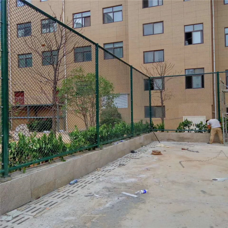圍網材質: pvc/pe包望勾花網,內絲采用低碳鋼絲鍍鋅處理,外表進行涂塑防腐處理。圍網生產工藝:編織焊接足球場團網表面處理:圍網采用EPVC包望絲,