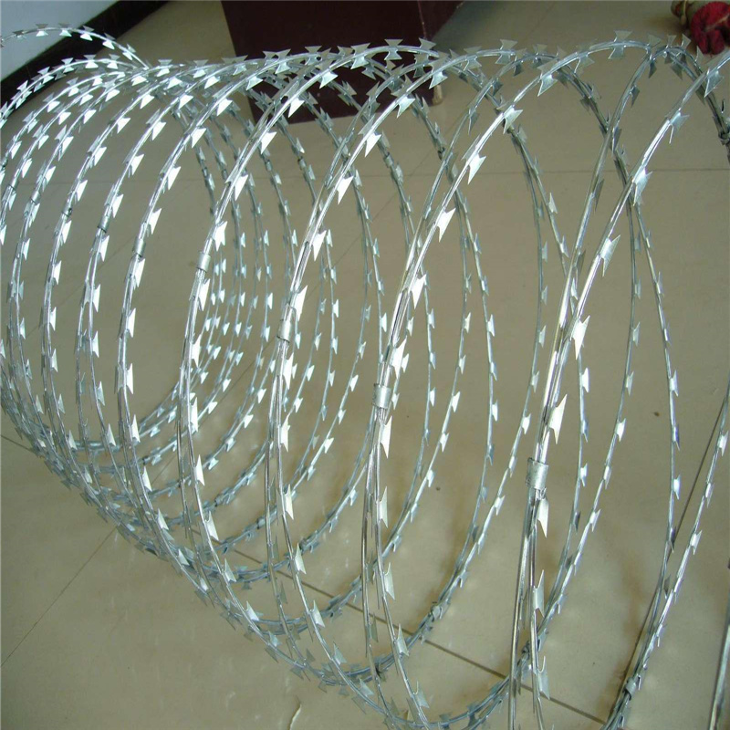 板做材料,由專用機(jī)械強(qiáng)力包附與熱鍍鋅高碳鋼絲或不銹鋼絲做的芯線上。由于有著鋒利美觀的刀片刺、高強(qiáng)度的芯線,使本產(chǎn)品綜合了防