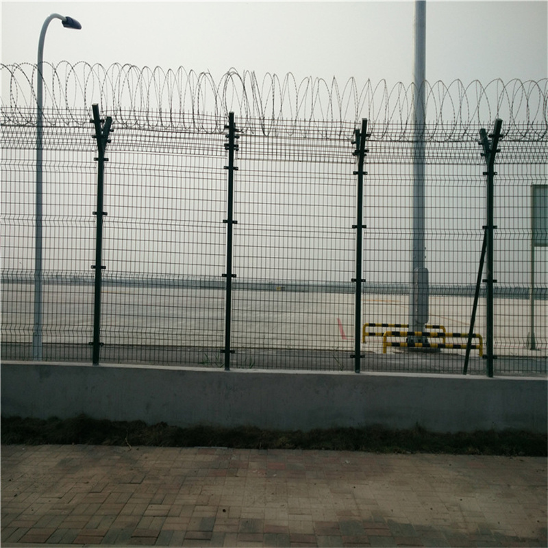 機場護欄網又稱作Y型安詳防止護網,鐵路護欄網,是由V型支架立柱增強型焊接片網,安詳防盜毗連件和熱鍍鋅刀片刺網構成強度和安詳防