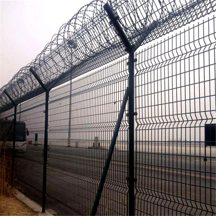 機場圍界材質(zhì):優(yōu)質(zhì)低碳鋼絲。網(wǎng)孔:50*50mm、50*100mm等也可按照具體要求定制。立柱:Y型、方形管、圓形管、桃形柱,采用5mm以上的高強度低碳鋼絲焊接。頂端:加裝刀片刺繩、刺絲、刺網(wǎng)。表面:電鍍、熱鍍、浸塑、噴塑、粉末靜電噴涂。網(wǎng)片中帶有V型加強筋,增加了圍網(wǎng)的沖擊力。
