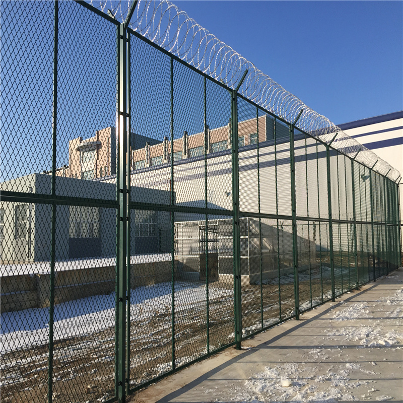 監獄防護網網絲材質都是選用Q235碳素鋼,1、網格大小:50mm×150mm堅密格型網加三道折彎,加固定框2、網片固定框:20×20×1.5mm國標方鋼管,增加一道垂直中稱3、網絲直徑:5mm,網片尺寸:2000mm-2500mm(可根據實際可用空間合理調整)。4、立柱規格:Y型柱直徑60mm×60mm×2.5mm方鋼。5、柱與網框連接方式:防盜螺絲貫穿式連接。6、網片頂端安裝刀片刺繩:芯絲直徑2.5mm、刀長21mm,刀寬15mm,刀片刺繩直徑500mm-600mm。